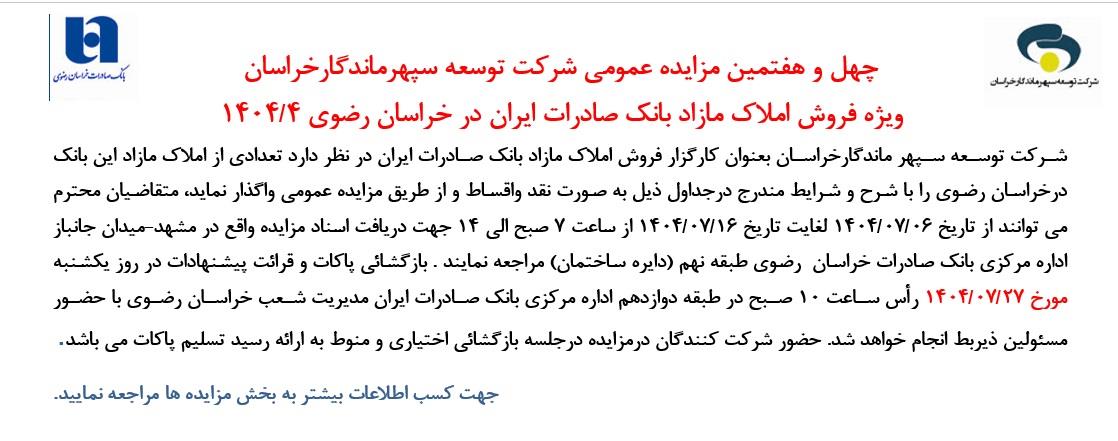 چهل و هفتمین اگهی مزایده بانك صادرات ایران ویژه خراسان رضوی 1404.4